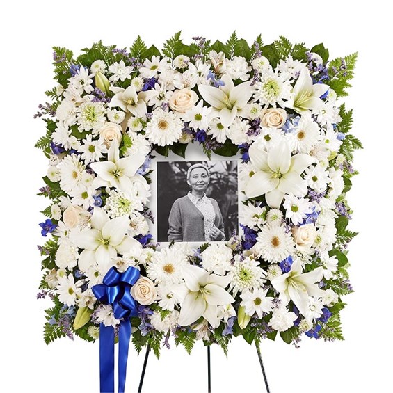 Offer solace with a sentimental arrangement for the services. Our square wreath features soothing-hued blooms and greenery for a lush, full presentation. A photo can be displayed in the center, creating a unique and beautiful tribute to a cherished loved one. Standing spray arrangement features a stylized 18" square wreath with white roses, Asiatic lilies, Peruvian lilies (alstroemeria), Gerbera daisies, mums, daisy poms, button poms and carnations, blue delphinium, purple Limonium; accented with assorted greenery and blue satin ribbon Measures approximately 31"H x 31"W without stand Arrives on an easel; measures 66"H Appropriate for the funeral home or gravesite Our florists hand-design each arrangement, so colors and varieties may vary due to local availability To ensure lasting beauty, Asiatic and Peruvian lilies may arrive in bud form and will fully bloom over the next few days